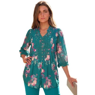 Roaman's Plus Size Juliet Lace Trim Button-Down Shirt 44 W, Teal Watercolor Bouquet