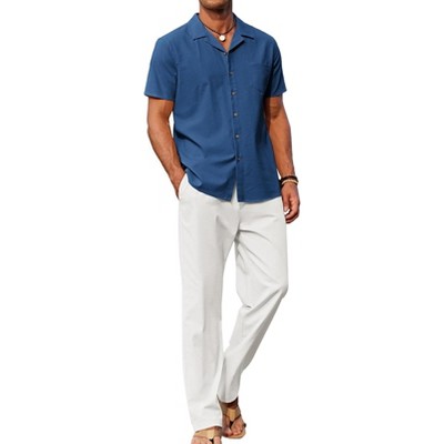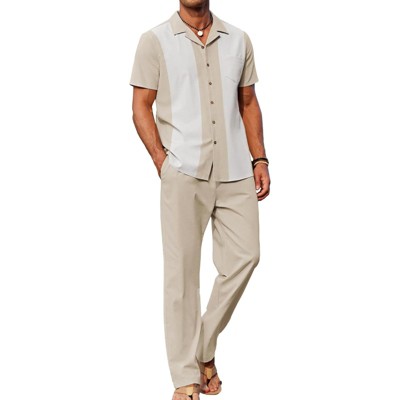 COOFANDY Men 2 Piece Linen Outfit Beach Button Down Shirt Casual Loose Pant Sets