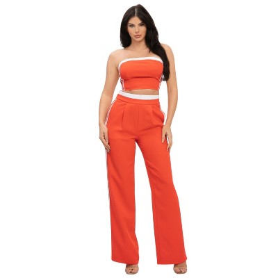 Slickblue Women’s Stripe Taping Contrast Elastic Band Top and Pants Set, Relaxed Two Piece Athleisure, Black/Orange, S-L