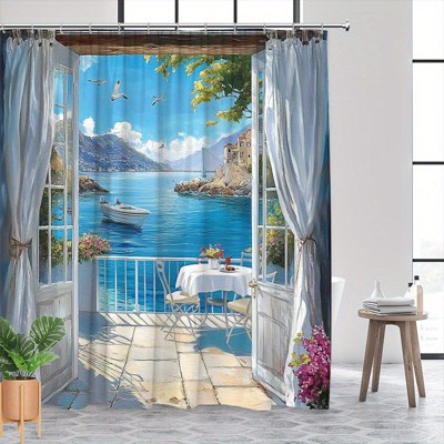 Lomsoe 1PC Coastal View Shower Curtain Featuring Blue Sea, Trees & Small Boat Pattern, Suit For Bathroom Decor with 12 Hooks.