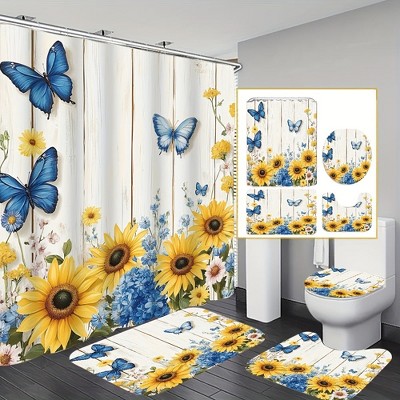 Lomsoe 4PCS Wood Grain Sunflower & Blue Butterfly Shower Curtain Full Set, Rustic Floral Design, Non-Slip Bath Rugs