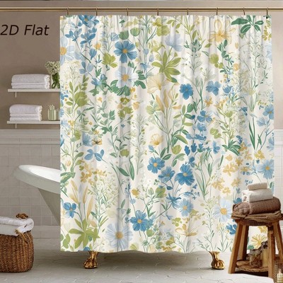 Lomsoe 1PC Blue & Green Floral Shower Curtain Featuring a Wildflower Design With 12 Hooks, Ideal for Bathroom Decor.