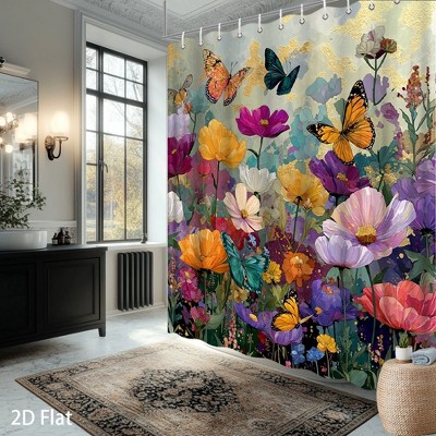 Lomsoe 1PC Colorful Butterfly & Flower Shower Curtain with Hooks, Machine Washable Fabric for Bathroom Decor.