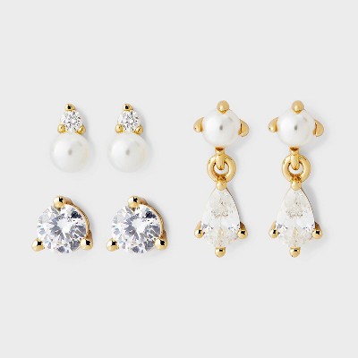 14K Gold Plated & Cubic Zirconia Pearl with Tear Drop Stud Stainless Steel Post Earring Set 3pc - A New Day™ Gold