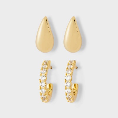 14K Gold Plated & Cubic Zirconia Chunky Tear Drop with Pave Hoop Stainless Steel Post Earring Set 2pc - A New Day™ Gold