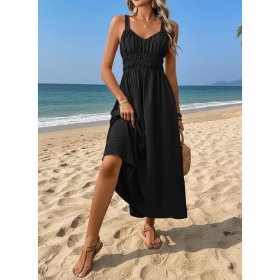 Women's Ruched Waist V-Neck Maxi Dress – Sleeveless Adjustable Straps Summer