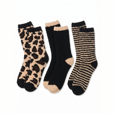 Tipi Toe Women's 3-Pairs Cozy Microfiber Anti-Skid Soft Leopard Striped Patterned Fuzzy Crew Socks