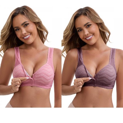 INSPIRE CHIC Women's Lace Front Closure Full Cup Wireless V-Neck Wide Straps Soft Breathable Push Up Everyday Bras 2 Packs