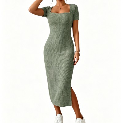 Womens Square Neck Ribbed Knit Maxi Dress Bodycon Short Sleeve Side Slit Casual Summer Dresses
