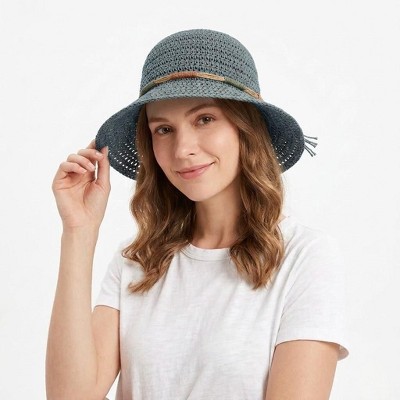 Anna-Kaci Women Crochet Bucket Hat Lightweight Breathable Straw Sun Hat with Woven Band, Dusty Blue