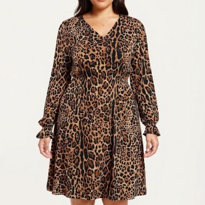Anna-Kaci Women's Long Sleeve Leopard Print Midi Dress with V Neck Elastic Waist Flowy A Line Fit Casual Dress