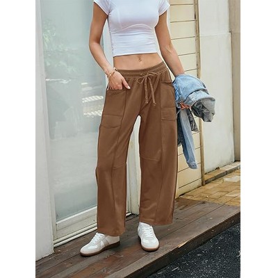 Womens Casual Pants Elastic Waist Drawstring Pocket Wide Leg Casual Pants