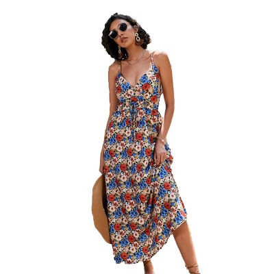 Spaghetti Straps Sundress Summer Causal Dresses for Women Floral Sleeveless Beach Dress V Neck Drawstring High Waist Maxi Dress