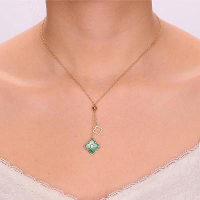 Lavari Jewelers Women's Flora Classic 16-18 Inch Adjustable Malachite Yellow Gold Plated Sterling Silver Four Petal Double Flower Pendant Necklace