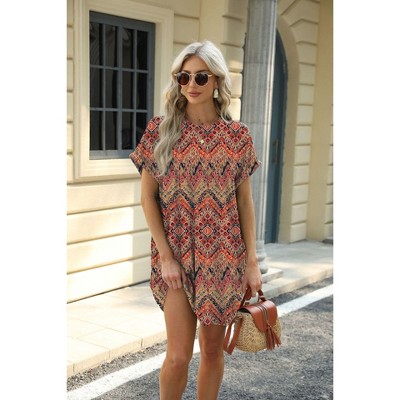 Women's Relaxed Crewneck Print Pocket Dress - Casual Short Sleeve Midi
