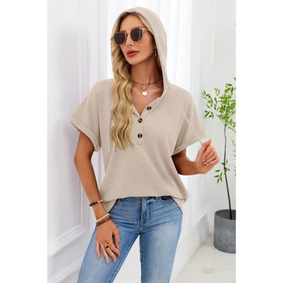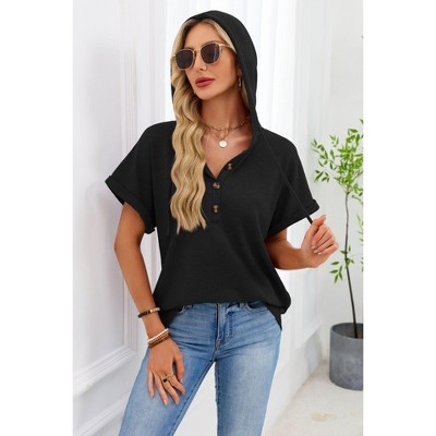 Women's Waffle Knit Button-Up Shirt Hooded Short Sleeve Top with Drawstring Trendy Oversized Blouse
