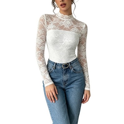Women's Floral Lace Long Sleeve Layering Blouse High Neck Semi-Sheer Fitted Shirt with Rear Zip Closure