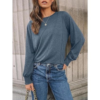 Women's Crew Neck Long Sleeve T-Shirt, Loose Fit Shirred Cuffs Casual Solid Color Top for Daily Wear
