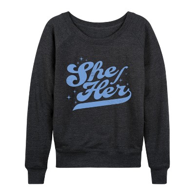 Women's - Instant Message - She Her Lightweight French Terry Wide Neck Long Sleeve Graphic Shirt