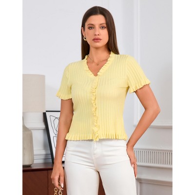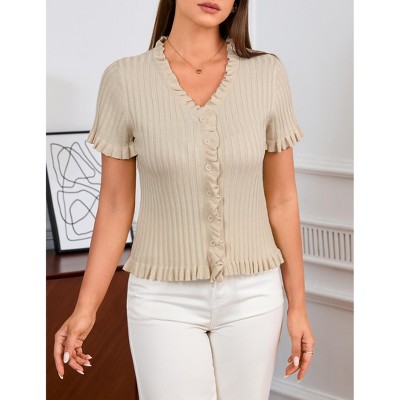 Women Short Sleeve Sweater Cardigan Shirt Summer Button Down Ruffle Trim Knit Top,Short Sleeve Tops Casual Summer Tees