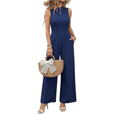 Ekouaer Summer Jumpsuits for Women Casual Mock Neck One Piece Outfits Sleeveless Formal Wide Leg Pants Romper with Pockets