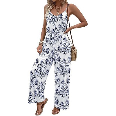Ekouaer Wide Leg Jumpsuits for Women Casual Overalls Sleeveless Vacation Outfits One Piece Boho Printed Romper with Pocket