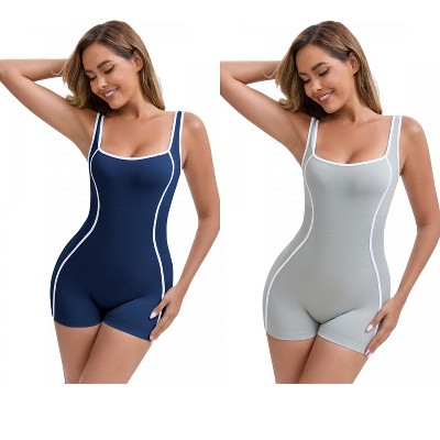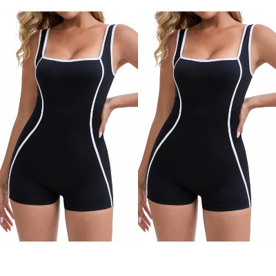 INSPIRE CHIC Women's Color Block Square Neck Sleeveless Seamless Shaping Jumpsuits Slimming Waist Tummy Control Sports Bodysuits 2 Packs