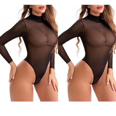 INSPIRE CHIC Women's Mesh Tight High Neck See Through Bold Jumpsuits Slimming Tummy Control Long Sleeve Bodysuit 2 Packs
