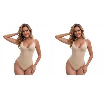 INSPIRE CHIC Women's Plunge Padded Tummy Control Slimming Waist Spaghetti Straps Seamless Soft Bodysuits 2 Packs
