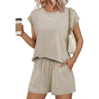 Women's 2 Piece Lounge Set Cap Short Sleeve T-Shirt Boho Top Summer Drawstring Waist Pocket Casual Shorts