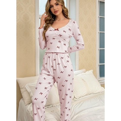 Women's Long-Sleeve Pajama Set with Elastic Long Pants and Bow Print, Suitable for Wearing at Home