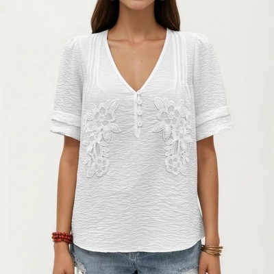 Anna-Kaci Women's Short Sleeve Blouse with V Neck Button Front Floral Embroidery Textured Casual Top