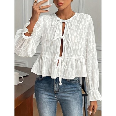 Women Long Sleeve Textured Blouse Tie Front Peplum Top Crew Neck Ruffle Hem Casual Shirt