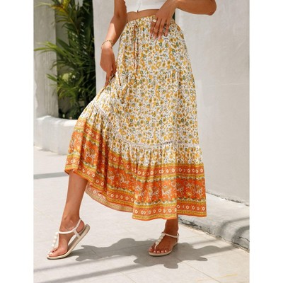 Coolmee Women's Boho Maxi Skirt Elastic Drawstring High Waist Tiered A-Line Ruffle Flowy Long Skirts
