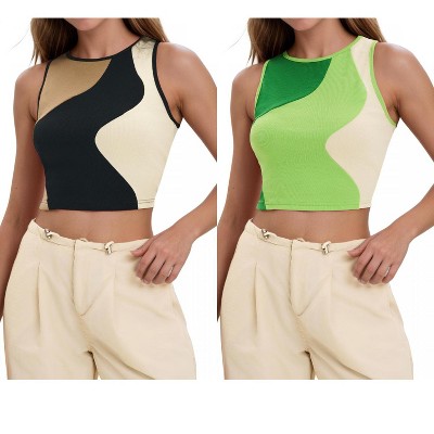 INSPIRE CHIC Women's Color Block Summer Crew Neck Ribbed Sleeveless Crop Going Out Tank Tops 2 Packs
