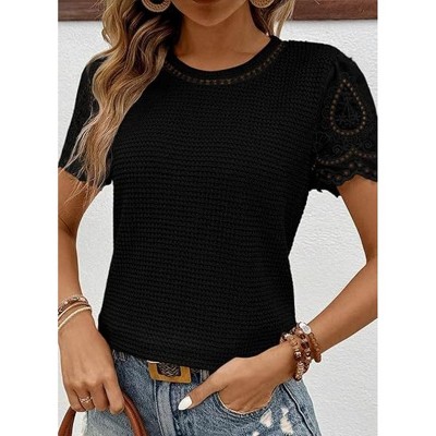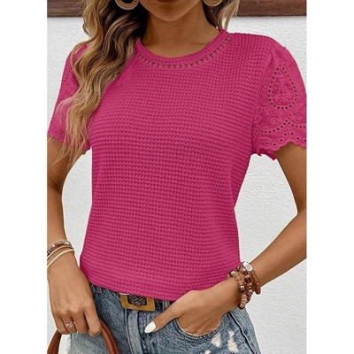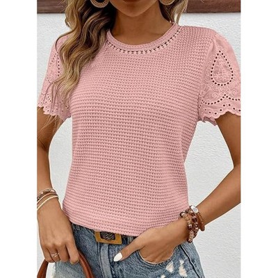 Womens Frenchy Summer Tops Crewneck Short Sleeve T Shirts Casual Waffle Knit Jacquard Blouses Top Shirts