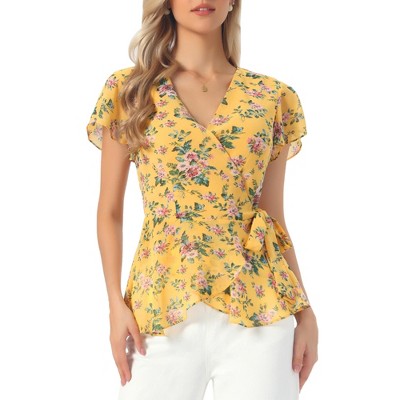 Allegra K Women's Floral Printed V Neck Short Sleeve Tie Waist Wrap Blouse